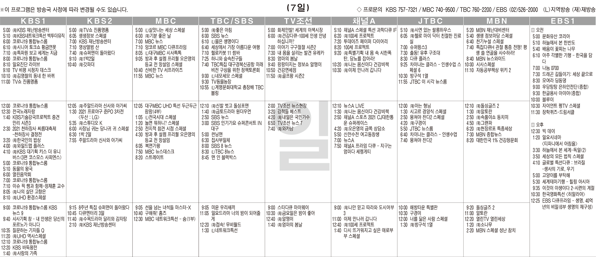 카카오톡 페이스북 트위터 전체 네이버밴드 네이버블로그 11월7일(일) TV 편성표 박성희 기사 전체보기 영남일보(www.yeongnam.com), 무단전재 및 수집, 재배포금지 연예인기뉴스