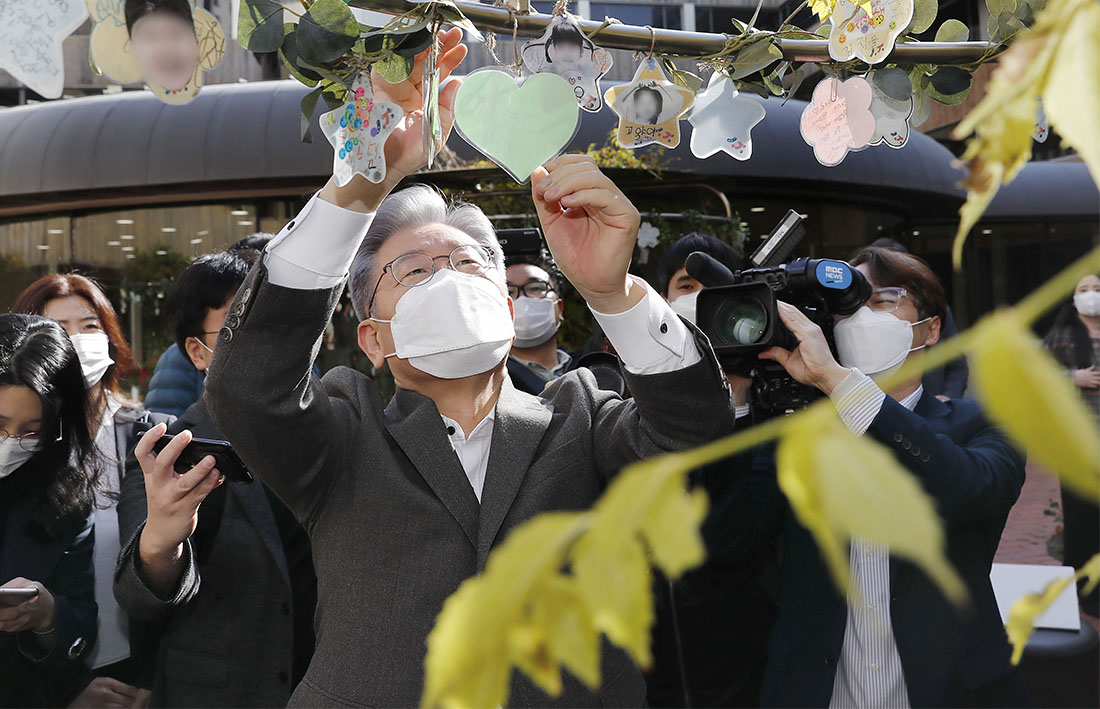 | 더불어민주당 이재명 대선 후보가 7일 서울 강서구 공립 지적장애 특수학교인 서진학교를 방문, 응원 메시지를 적어 나무에 달고 있다. 연합뉴스 |