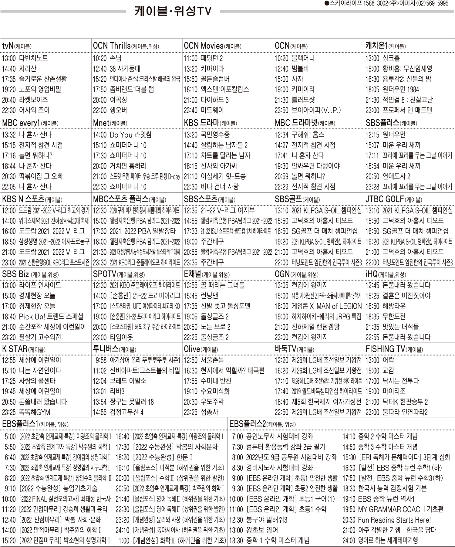 카카오톡 페이스북 트위터 전체 네이버밴드 네이버블로그 11월8일(월) 케이블·위성TV 편성표 박성희 기사 전체보기 영남일보(www.yeongnam.com), 무단전재 및 수집, 재배포금지 연예인기뉴스