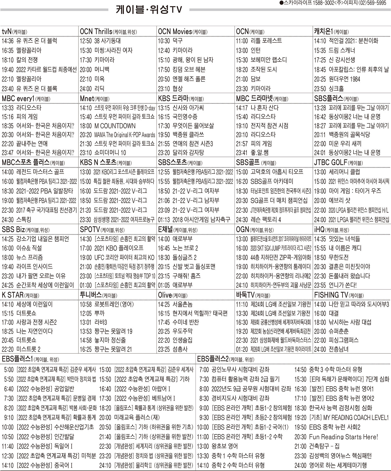 카카오톡 페이스북 트위터 전체 네이버밴드 네이버블로그 11월11일(목) 케이블·위성TV 편성표 박성희 기사 전체보기 영남일보(www.yeongnam.com), 무단전재 및 수집, 재배포금지 연예인기뉴스