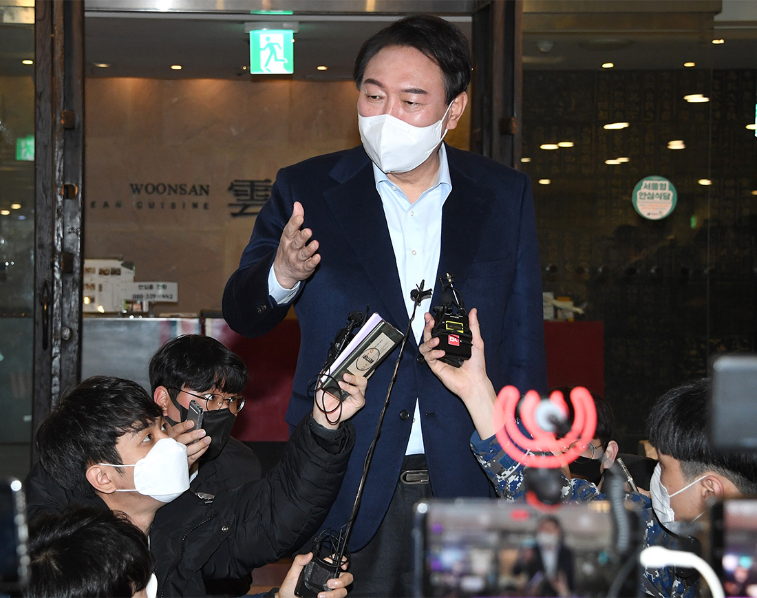 | 국민의힘 윤석열 대선 후보가 23일 서울 여의도의 한 식당에서 당내 경선에서 경쟁했던 후보들과 오찬을 하기에 앞서 취재진의 질문에 답하고 있다. 연합뉴스 |