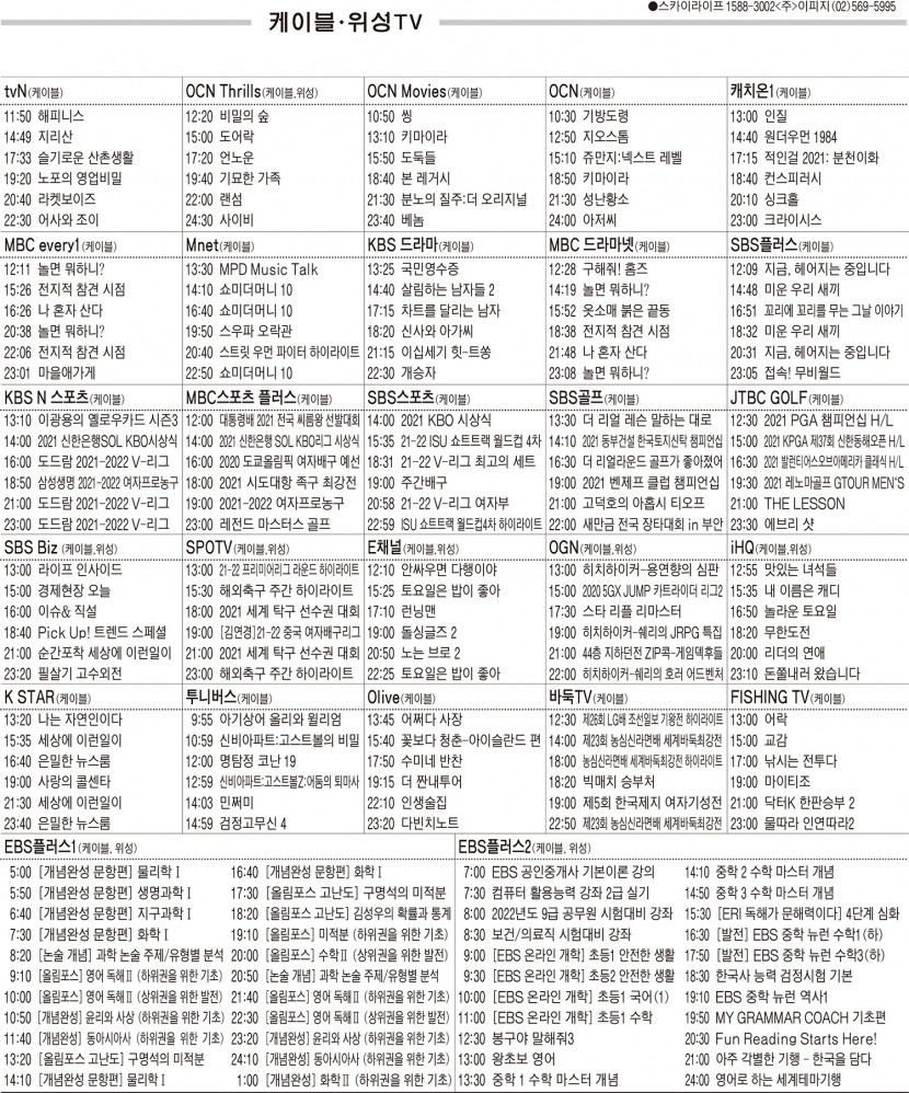 카카오톡 페이스북 트위터 전체 네이버밴드 네이버블로그 11월29일(월) 케이블·위성TV 편성표 박성희 기사 전체보기 영남일보(www.yeongnam.com), 무단전재 및 수집, 재배포금지 연예인기뉴스