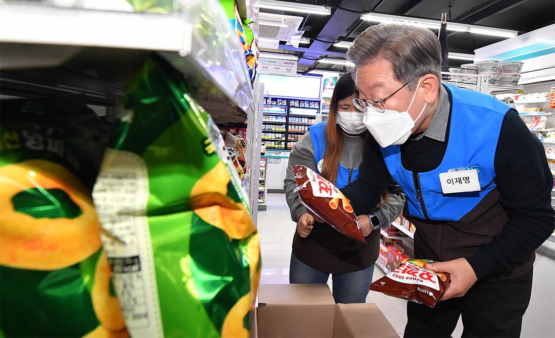 | 더불어민주당 이재명 대선 후보가 8일 오후 서울 서초구 장애인 직업훈련 편의점을 방문, 상품들을 직접 진열하고 있다. 연합뉴스 |
