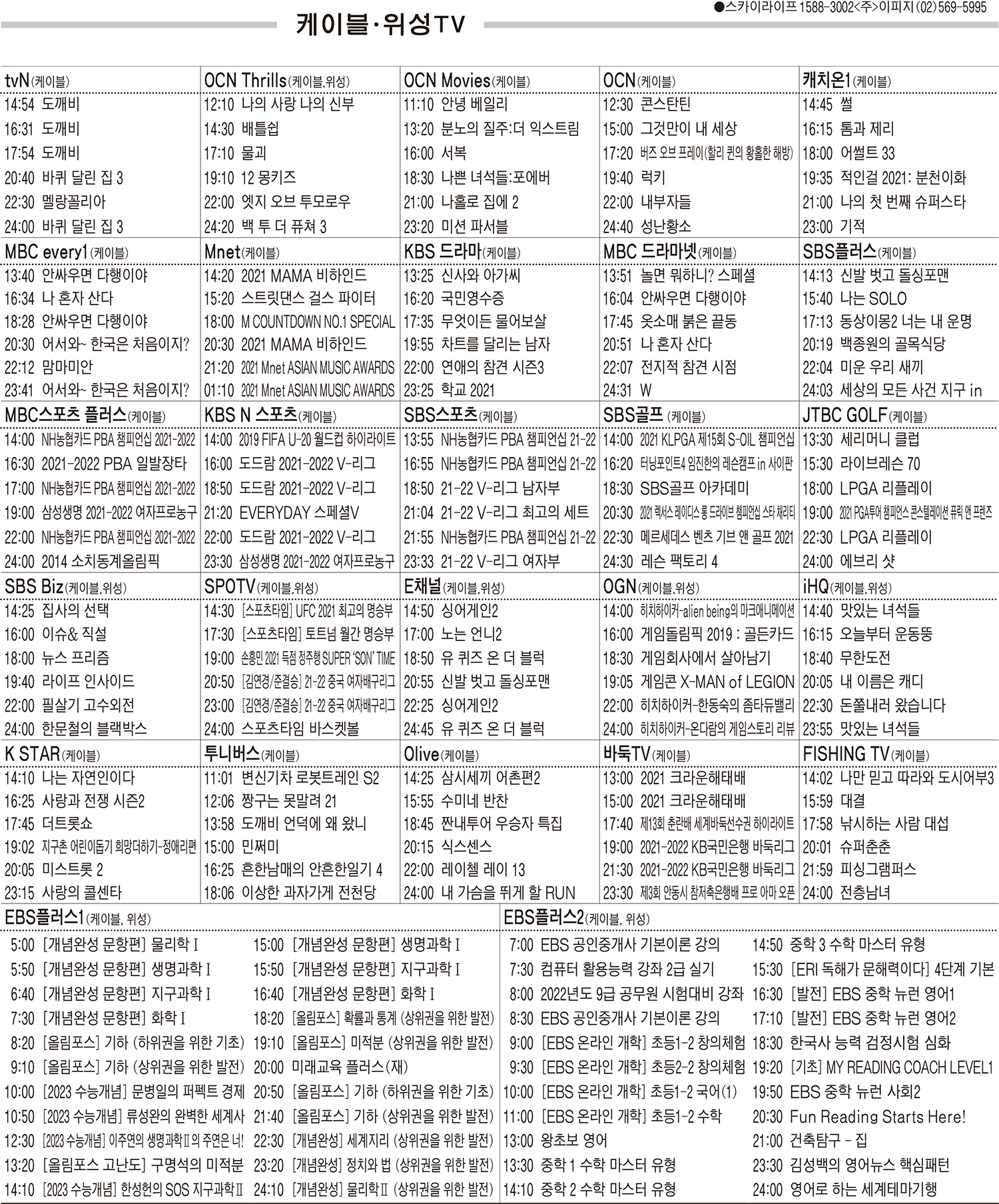 카카오톡 페이스북 트위터 전체 네이버밴드 네이버블로그 12월30일(목) 케이블·위성TV 편성표 박성희 기사 전체보기 영남일보(www.yeongnam.com), 무단전재 및 수집, 재배포금지 연예인기뉴스