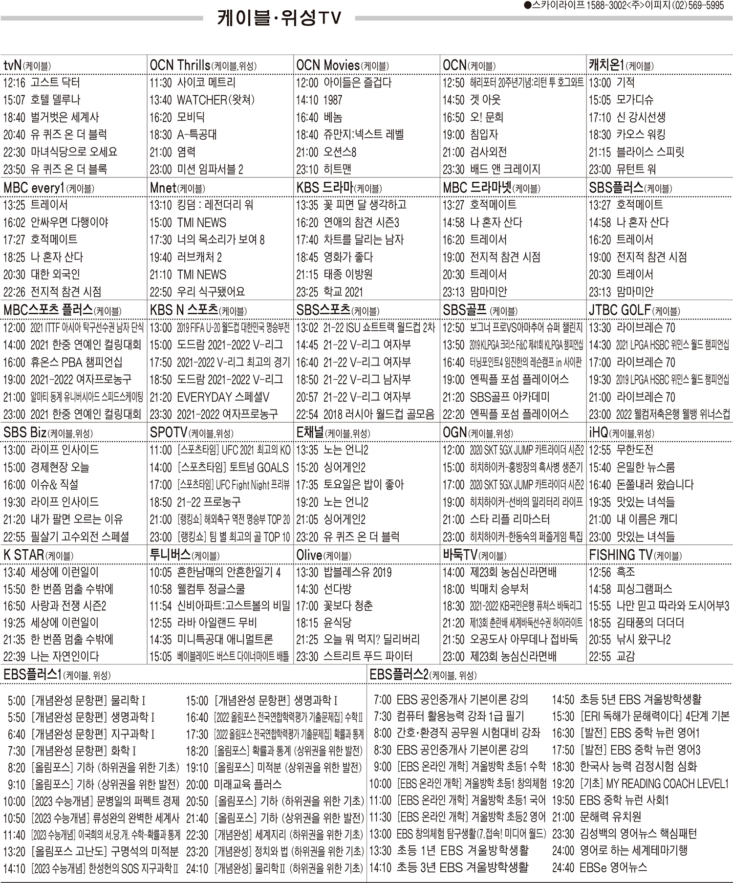 카카오톡 페이스북 트위터 전체 네이버밴드 네이버블로그 1월12일(수) 케이블·위성TV 편성표 박성희 기사 전체보기 영남일보(www.yeongnam.com), 무단전재 및 수집, 재배포금지 연예인기뉴스