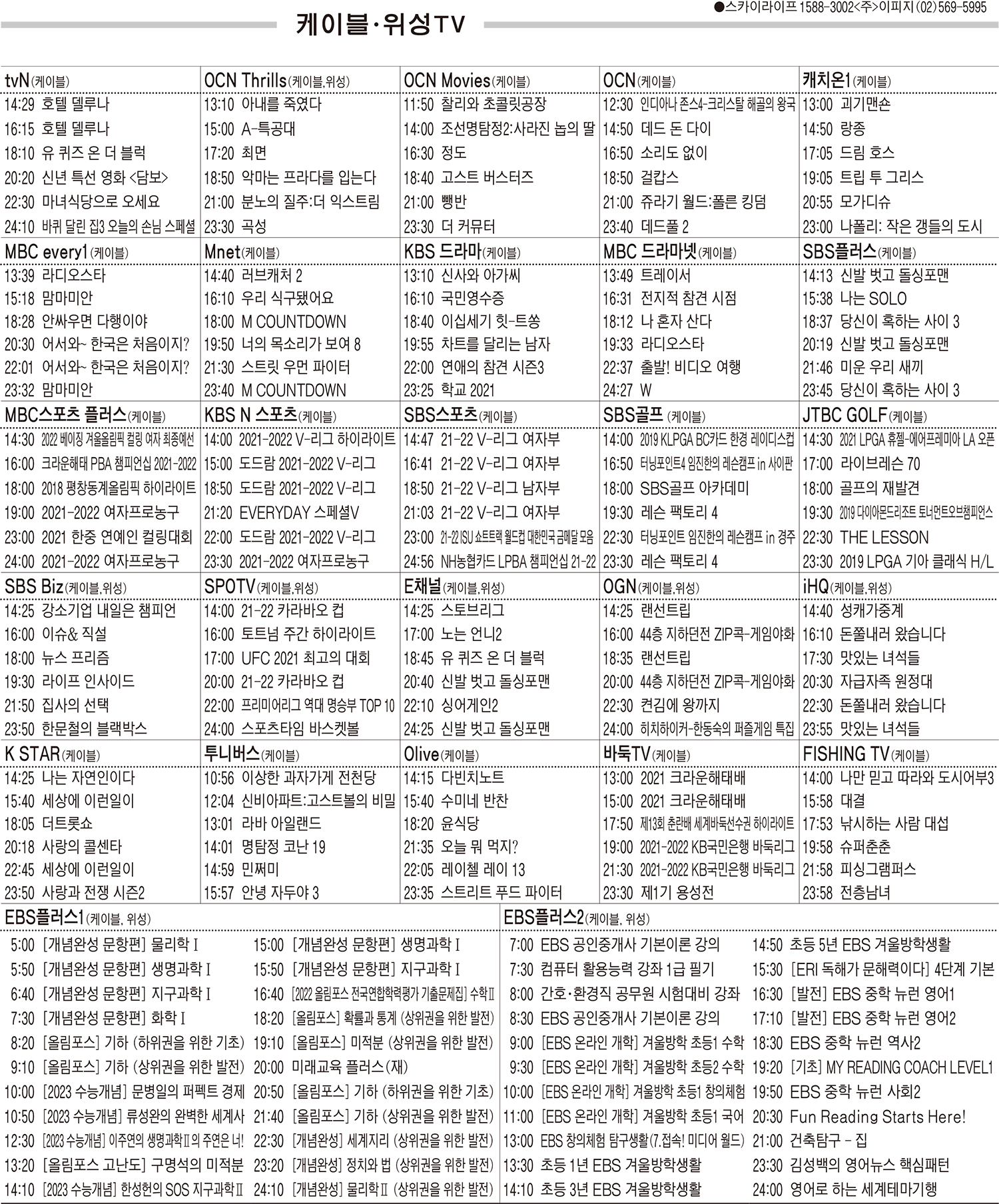 카카오톡 페이스북 트위터 전체 네이버밴드 네이버블로그 1월13일(목) 케이블·위성TV 편성표 박성희 기사 전체보기 영남일보(www.yeongnam.com), 무단전재 및 수집, 재배포금지 연예인기뉴스