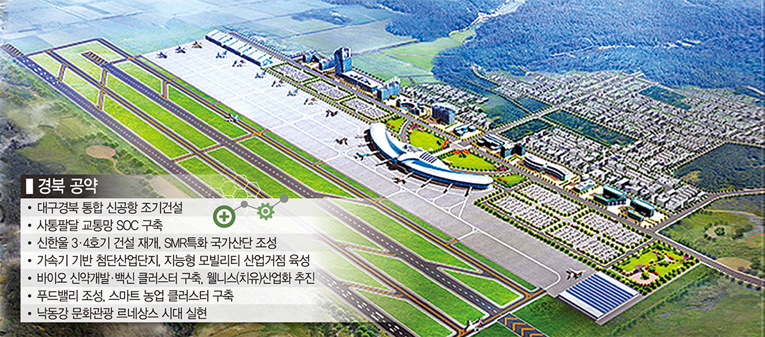 ▲대구 경북 통합 신공항 조기 건설 = 대구경북통합신공항을 중남부권 거점 경제물류공항으로 만들기 위해 항공수출 물류가 주변 지역으로 생산되도록 추진한다. 또 주변 지역을 글로벌 공항 경제권으로 형성해 지역발전의 원동력으로 삼는다. △항공(드론) 전자부품거점 단지 조성 △스마트 항공벤처 연구단지 조성 △군수정비산업 특화단지 조성 △드론정비 MRO사업 관련 기업 집적화