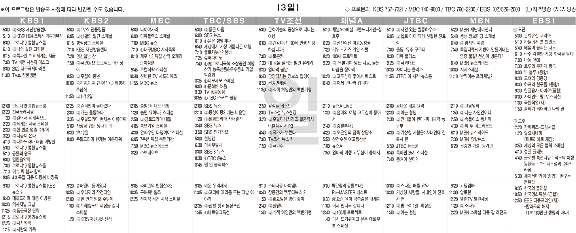 카카오톡 페이스북 트위터 전체 네이버밴드 네이버블로그 4월3일(일) TV 편성표 박성희 기사 전체보기 영남일보(www.yeongnam.com), 무단전재 및 수집, 재배포금지 연예인기뉴스