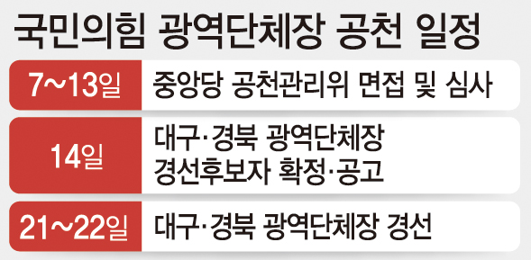 국민의힘 공천관리위원회는 지난 4일부터 이날까지 광역 단체장 공천 신청을 접수했다. 대구는 전국에서 경쟁률이 가장 높았다. 권용범 전 대구경북벤처기업협회장, 김재원 전 최고위원, 김점수 대구가톨릭대 산학협력교수, 김형기 경북대 명예교수, 유영하 변호사, 이진숙 전 대전MBC 사장, 정상환 법률자문위 부위원장, 홍준표 의원 등 8명이 등록했다. 경북에서는 이철우 도지사가 유일하게 이름을 올렸다.