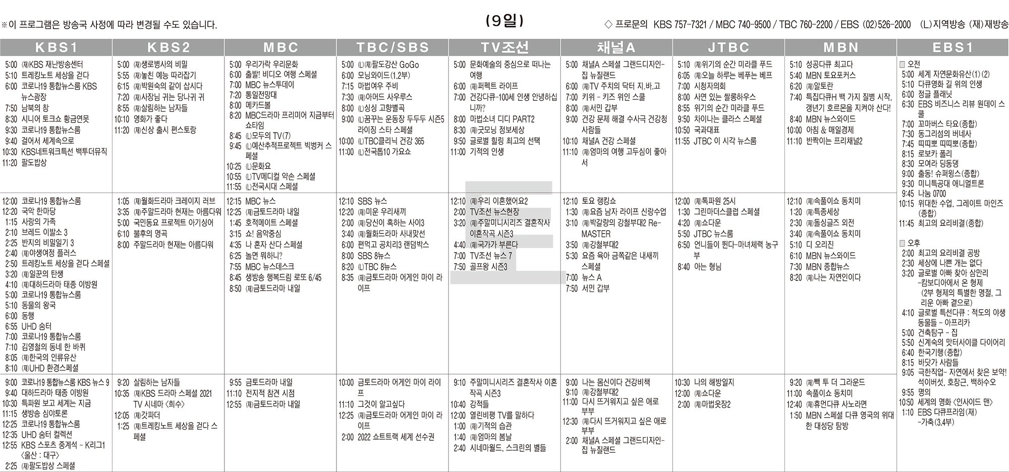 카카오톡 페이스북 트위터 전체 네이버밴드 네이버블로그 4월9일(토) TV 편성표 박성희 기사 전체보기 영남일보(www.yeongnam.com), 무단전재 및 수집, 재배포금지 연예인기뉴스