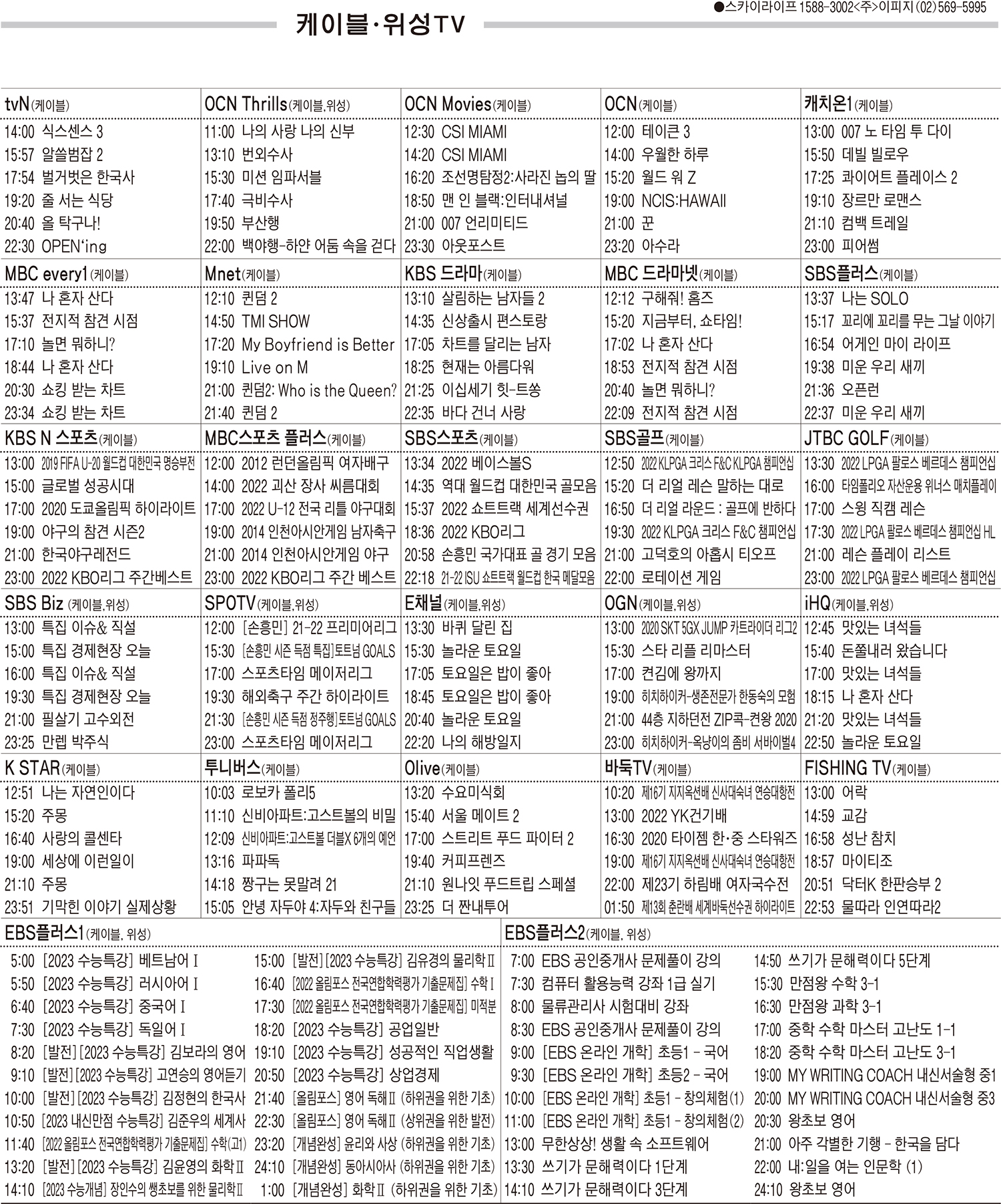 카카오톡 페이스북 트위터 전체 네이버밴드 네이버블로그 5월2일(월) 케이블·위성TV 편성표 박성희 기사 전체보기 영남일보(www.yeongnam.com), 무단전재 및 수집, 재배포금지 연예인기뉴스
