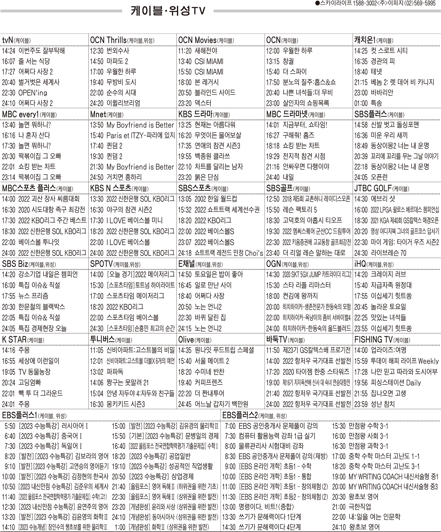 카카오톡 페이스북 트위터 전체 네이버밴드 네이버블로그 5월3일(화) 케이블·위성TV 편성표 박성희 기사 전체보기 영남일보(www.yeongnam.com), 무단전재 및 수집, 재배포금지 연예인기뉴스