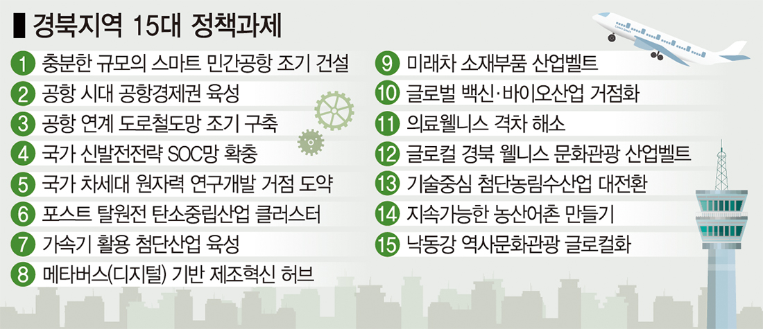 대구경북통합신공항 건설을 위한 정책과제뿐 아니라상대적으로 낙후된 경북 일부 권역의 균형 발전을 이끌 수 있는 각종 SOC(사회간접자본) 사업 등이 포함됐다. 이외에도 지역에서 차세대 먹거리로 발굴 중인 메타버스·미래 자동차 관련 산업 등도 발전의 틀을 마련했다.