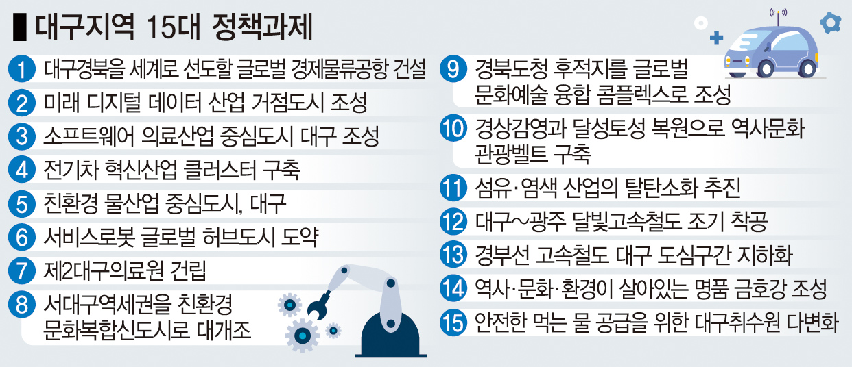 제2대구의료원 건립도 정책과제에 포함됐다. 앞서 지난 3월 대구시가 지역 간 의료자원 불균형 해소 등을 위해 대구 동북권에 제2 대구의료원 설립을 추진한다고 밝힌 데 이어 권영진 시장이 관련 내용을 인수위에 건의하겠다고 공언한 바 있다. 이날 보고회에서 특위는 "대구도 공공의료원 추가 설립 요구가 높다"고 강조해 건립에 힘을 실었다. 특위는 서대구역세권 개발 방향에 대해서도 밝혔다. '친환경 문화복합신도시'를 테마로 2026년까지 복합환승센터를 건립하고 2027년까지 하폐수처리장 통합지하화를 추진하겠다는 계획이다. 또 매천대교~이현삼거리 도로 건설, 북비산로 동서 간 지하차도 건설, 트램(서대구역~두류역~안지랑역 6.7㎞) 건설을 통해 서대구역 인근 교통망을 확충한다는 복안이다.