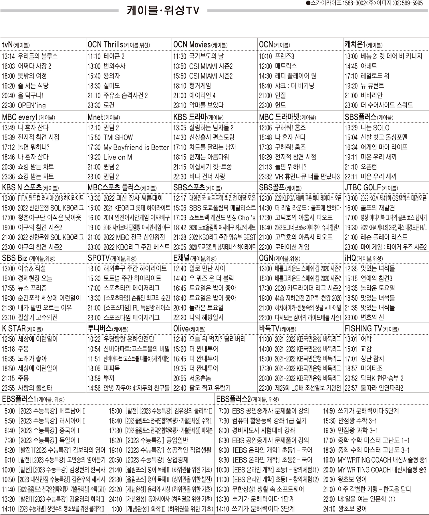 카카오톡 페이스북 트위터 전체 네이버밴드 네이버블로그 5월9일(월) 케이블·위성TV 편성표 박성희 기사 전체보기 영남일보(www.yeongnam.com), 무단전재 및 수집, 재배포금지 연예인기뉴스