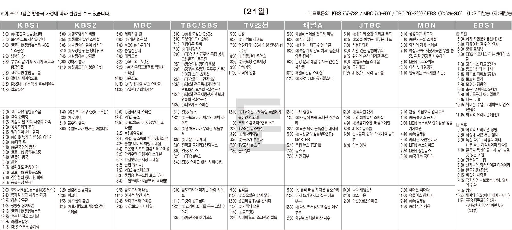 카카오톡 페이스북 트위터 전체 네이버밴드 네이버블로그 5월21일(토) TV 편성표 박성희 기사 전체보기 영남일보(www.yeongnam.com), 무단전재 및 수집, 재배포금지 연예인기뉴스