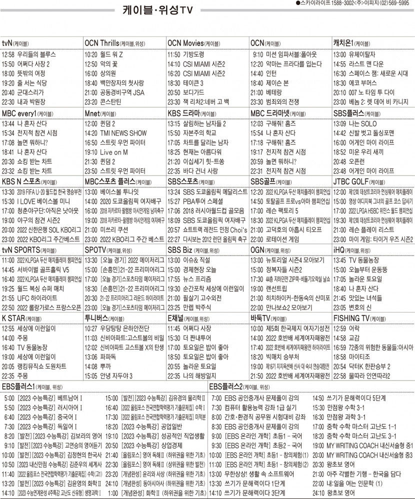 카카오톡 페이스북 트위터 전체 네이버밴드 네이버블로그 5월23일(월) 케이블·위성TV 편성표 박성희 기사 전체보기 영남일보(www.yeongnam.com), 무단전재 및 수집, 재배포금지 연예인기뉴스