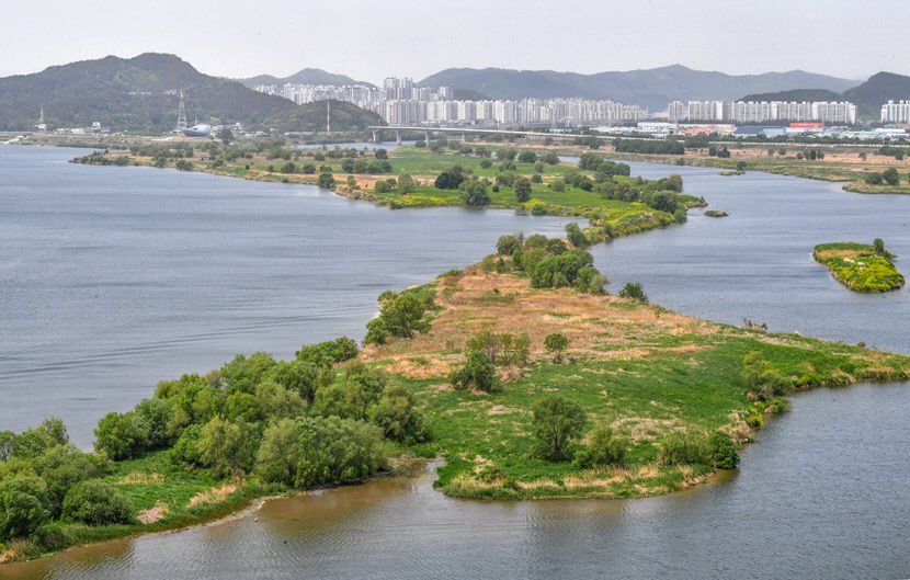 | 대구 달성 화원동산 전망대에서 내려다 본 달성습지 전경. 습지의 모양이 아메리카 대륙을 닮았다. 멸종위기 야생동물 등 약 520종의 생물이 서식하는 달성습지는 생태학적으로 보전 가치가 높다. |