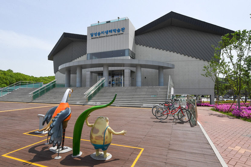 | 흑두루미가 날개를 접은 모습을 형상화한 달성습지생태학습관. 건물 앞에는 마스코트인 (두)루미와 (맹)꽁이 조형물이 서 있다. |