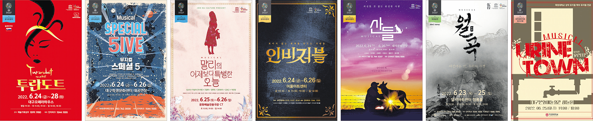 | 제16회 대구국제뮤지컬페스티벌 첫 주에 공연하는 7개 작품. 왼쪽부터 '뮤지컬 투란도트-슬로바키아 ver.' '스페셜5' '말리의 어제보다 특별한 오늘' '인비저블' '산들' '월곡' '유린타운' 포스터. |