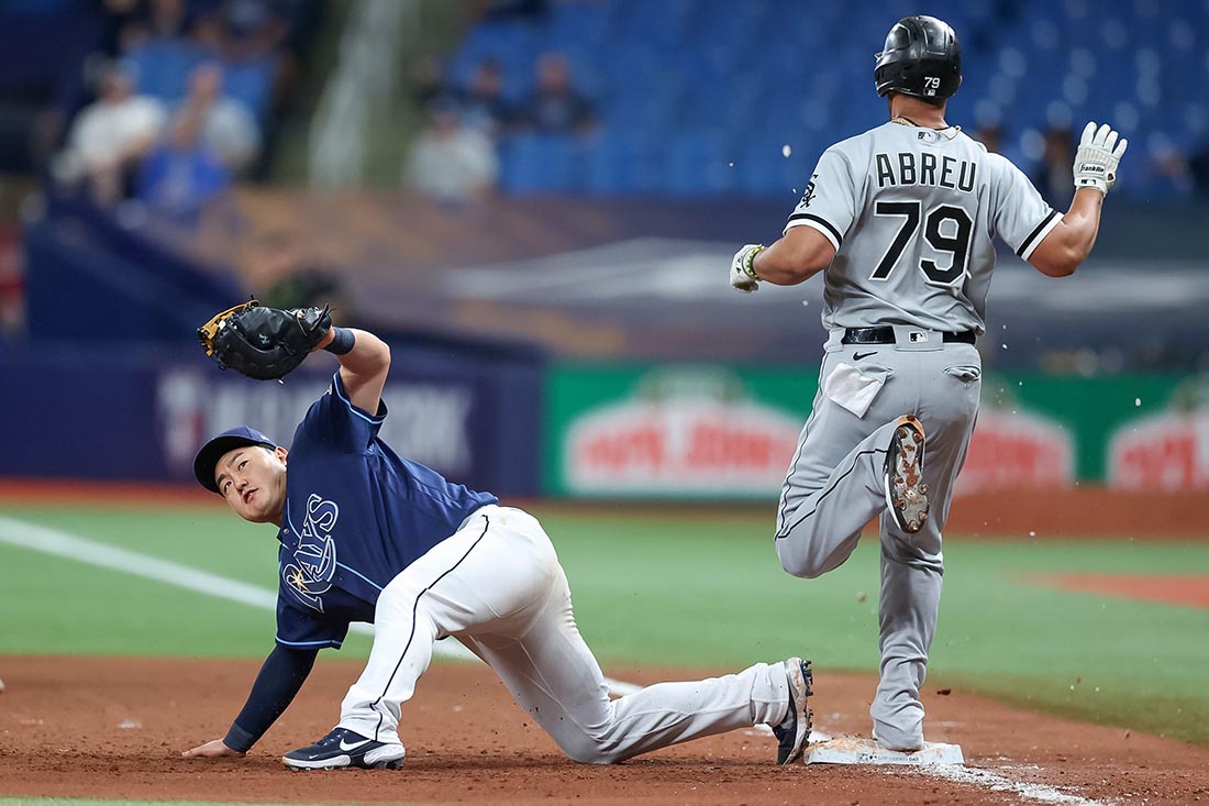 | 지난 4일(한국시각) 미국 플로리다 트로피카나 필드에서 열린 미국프로야구 탬파베이 레이스-시카고 화이트삭스 경기에서 탬파베이의 최지만이 8회초 1루에서 포구한 공을 체크하고 있다. 연합뉴스 |