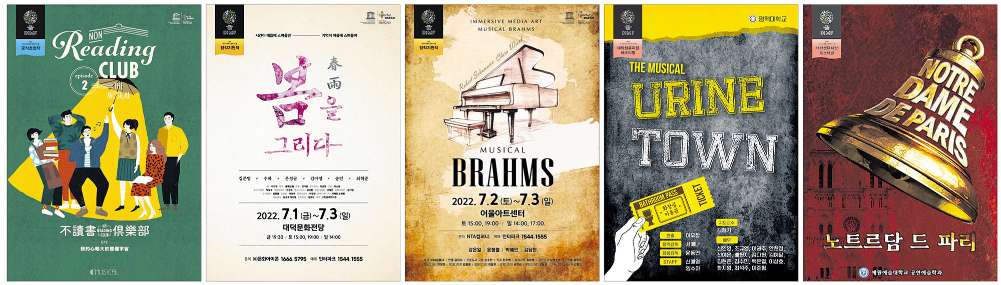세계적인 명작부터 창작뮤지컬까지 만날 수 있는 대학생뮤지컬페스티벌도 볼 수 있다. 백석문화예술학부 뮤지컬과(27일, 아양아트센터 아양홀)와 수원대 문화예술학부 연극전공(7월2일, 달서아트센터)의 뮤지컬 레미제라블이 공연된다. 또 예원예술대 공연예술학과(7월1일, 아양아트센터 아양홀)의 노트르담 드 파리, 평택대 음악학과 및 공연콘텐츠학과(7월3일, 대구문화예술회관 비슬홀)의 유린타운이 무대에 오른다.