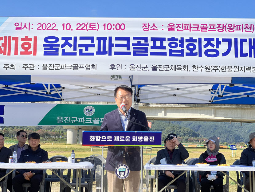 | 손병복 울진군수가 '제 1회 울진군 파크골프 협회장'기 대회에서 축사를 하고 있다. |