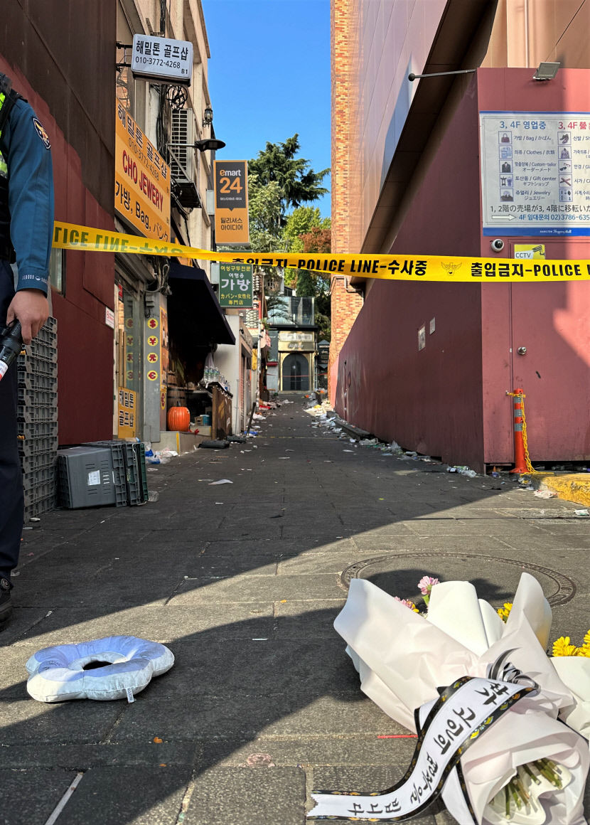 | 30일 오후 이태원 참사 현장은 삭막한 분위기를 자아내고 있다. 시민이 놓고간 조화가 희생자의 넋을 조금이나마 위로하는 듯하다. 정재훈기자 jjhoon@yeongnam.com |