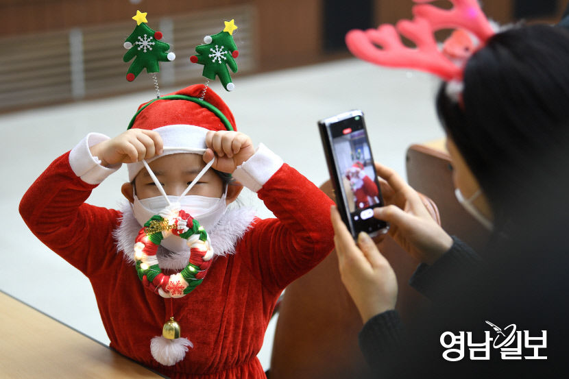 17일 오전 대구 달서구청 대강당에서 열린 '2022 달서 희망 나눔꾸러미' 가족봉사활동에 참가한 한 어린이가 직접 만든 크리스마스 도어벨을 들어보이고 있다. 이날 행사에서 만들어진 나눔꾸러미는 크리스마스 도어벨과 학용품 등으로 구성됐으며, 관내 취약계층 아동 100명에게 전달될 예정이다. 윤관식기자 yks@yeongnam.com
