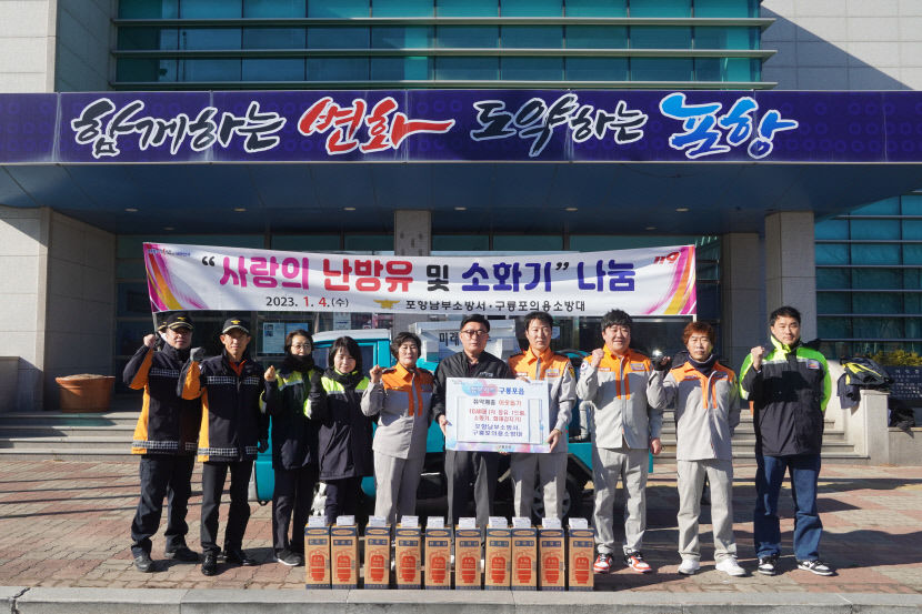 포항남부소방서는 구룡포의용소방대와 함께 4일 오전 포항시 남구 구룡포읍행정복지센터에서 '사랑의 난방유 나눔 행사'를 갖고 저소득층과 독거노인 10가구에 220만 원 상당의 난방유와 소화기 10기, 단독경보형 감지기 10개를 전달했다.