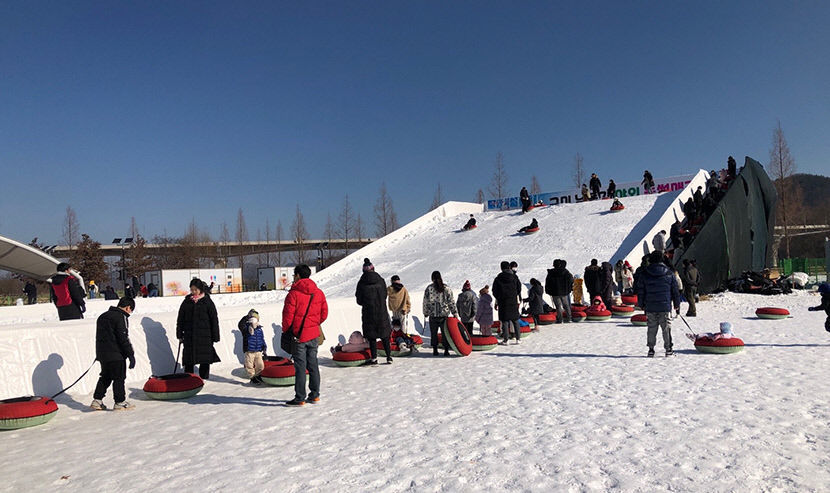 코로나19로 위축된 겨울 레저 스포츠를 만끽할 수 있는 눈썰매장이 구미시 낙동제방길에 있다. 지난해 12월23일 낙동강 체육공원 캠핑장 인근에 개장한 야외 눈썰매장<사진>으로, 이달 말까지 운영한다.