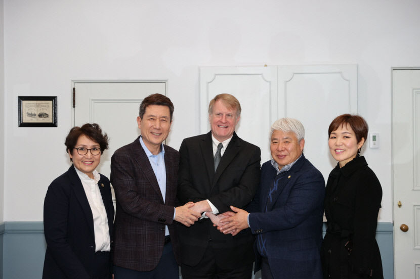 | 이강덕(왼쪽 둘째부터) 포항시장, 리치 피츠제럴드 엘러게니 카운티 수장, 백인규 포항시의회 의장이 기념촬영을 하고 있다.<포항시 제공> |