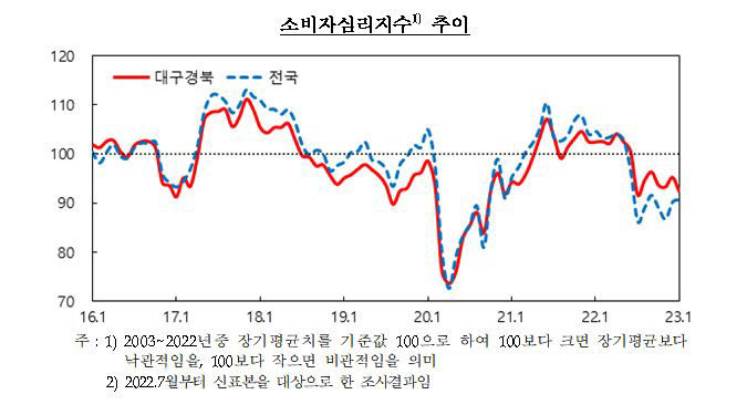 27일 한국은행 대구경북본부가 발표한 '2023년 1월 대구경북지역 소비자동향조사' 결과에 따르면 이달 소비자심리지수(기준 100)는 92.3으로전월(95.3)대비 3포인트 하락했다.