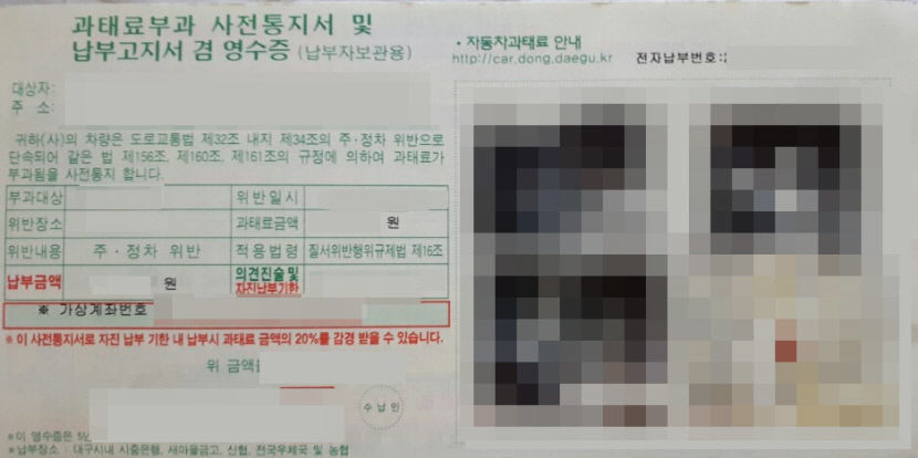 | 대구 한 경찰 간부가 범칙금 고지서를 허위로 발부하다 발각됐다. 사진은 과태료 부과 사전통지서 및 납부고지서 겸 영수증. <영남일보 DB> |