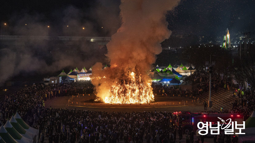 5일 오후 경북 청도군 청도천에서 열린 '정월대보름 민속한마당'을 찾은 많은 시민들이 달집태우기를 지켜보고 있다. 이날 열린 정월대보름 행사는 조류인플루엔자(AI)와 코로나19 등으로 인해 5년만에 개최됐다.