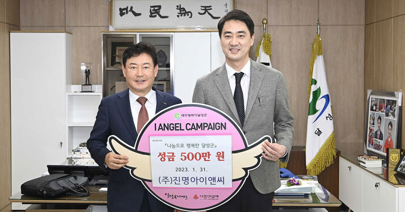 <주>진명아이앤씨(대표 권오복·왼쪽)가 대구 달성군에 이웃돕기 성금 500만원을 기탁했다. 이 성금은 달성복지재단을 통해 지역의 어려운 이웃에게 전달된다.