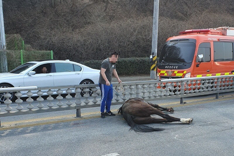 119구조대가 현장에 도착했을 때 말 3마리는 주인 없이 도로를 활보 중이었고, 1마리는 그랜져 차량과 부딪혀 쓰러져 있는 상태였다.