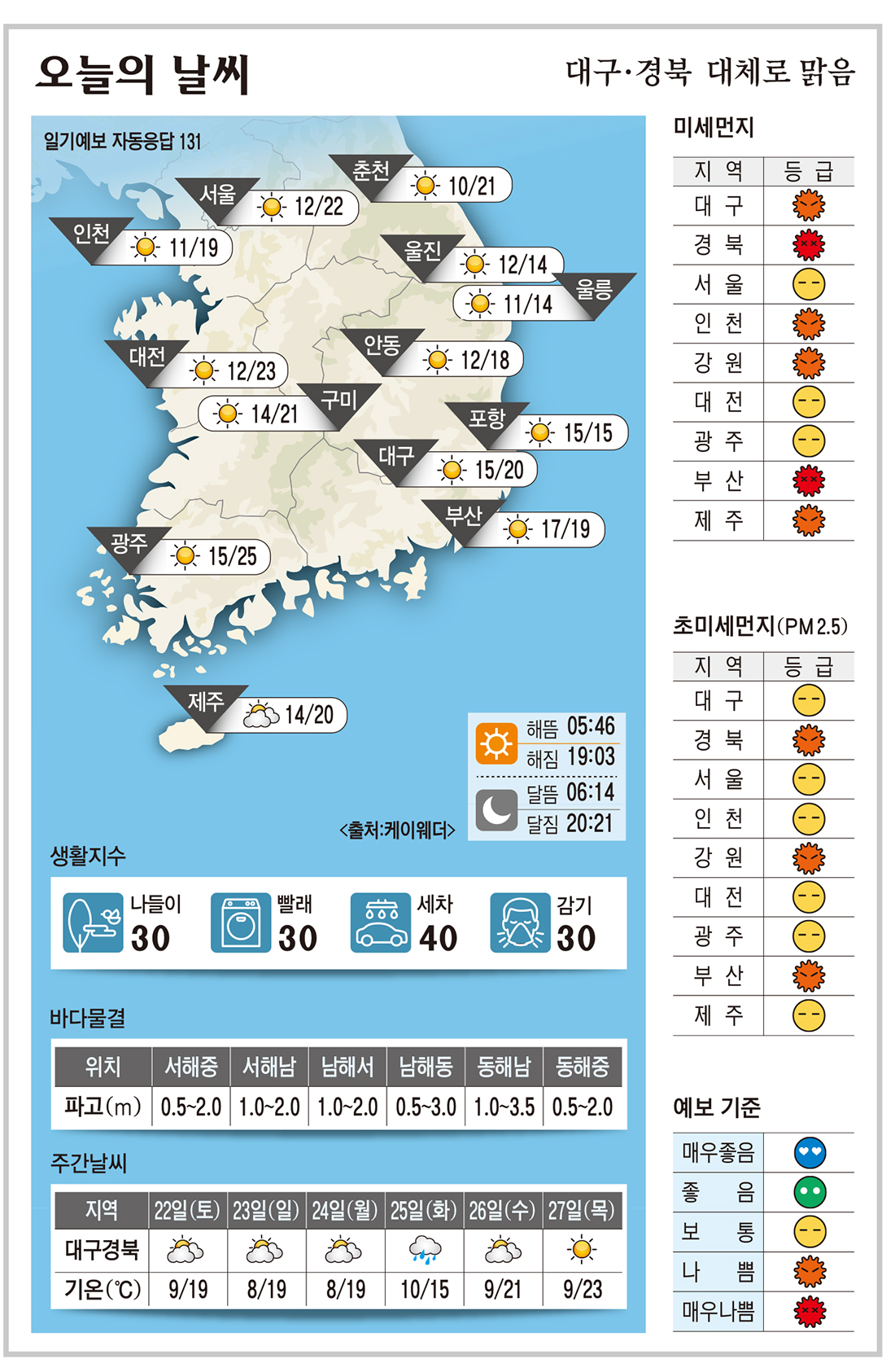 카카오톡 페이스북 트위터 전체 네이버밴드 네이버블로그 대구·경북 오늘의 날씨(4월 21일)…대체로 맑음 사회부 기사 전체보기 영남일보(www.yeongnam.com), 무단전재 및 수집, 재배포금지 사회인기뉴스 “국토부 최종 절차 중” TK공항(민항) 기본계획, 이르면 이번 주 고시‘글로벌 미디어아트 관문’ 꿈꾸는 대구 연호지구…남겨진 과제는 ‘내실’