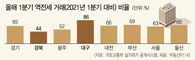 23일 부동산R114 조사(12일 기준)에 따르면, 올해 1분기 대구 아파트 전세 거래 1천102건 중 948건(86%)이 2년 전(2021년 1분기)과 견줘 더 낮은 가격에 계약이 이뤄졌다. 역전세 거래 비율로 치면 86%다.