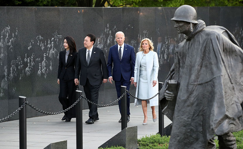 | 미국을 국빈 방문한 윤석열 대통령과 조 바이든 미국 대통령 내외가 지난 25일(현지시각) 워싱턴D.C. 한국전참전용사기념공원을 방문하고 있다. 연합뉴스 |