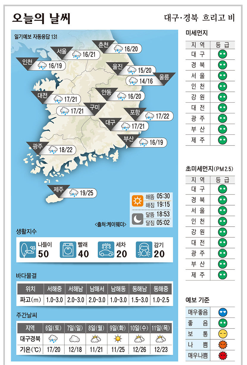 카카오톡 페이스북 트위터 전체 네이버밴드 네이버블로그 대구·경북 오늘의 날씨(5월 5일)…흐리고 비 사회부 기사 전체보기 영남일보(www.yeongnam.com), 무단전재 및 수집, 재배포금지 #날씨# 오늘날씨# 대구경북 날씨 사회인기뉴스 “국토부 최종 절차 중” TK공항(민항) 기본계획, 이르면 이번 주 고시‘글로벌 미디어아트 관문’ 꿈꾸는 대구 연호지구…남겨진 과제는 ‘내실’
