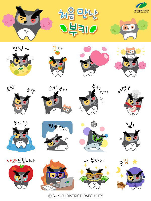 | 대구 북구청이 공식 캐릭터 '부키(BOOKEY)'를 활용해 만든 카카오톡 이모티콘. 오는 12일부터 선착순 배포한다. 대구 북구청 제공 |