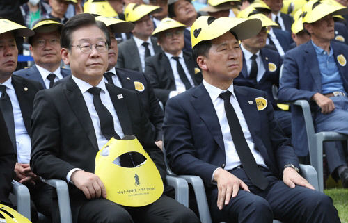 | 더불어민주당 이재명 대표(왼쪽)와 국민의힘 김기현 대표가 지난달 23일 경남 김해시 진영읍 봉하마을에서 열린 노무현 전 대통령 서거 14주기 추도식에 참석해 추도식 영상을 바라보고 있는 모습. 연합뉴스 |