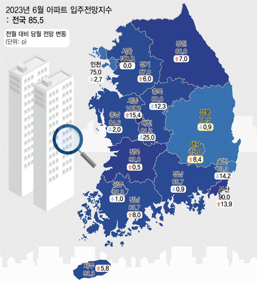 6월 대구 아파트 입주전망지수는 75로 전월(66.6)보다 8.4포인트 상승했다. 지난 4월(72) 11개월 만에 회복했던 '70선'이 지난 5월(66.6)에 곧바로 무너졌다가 다시 70선대로 올라선 것. 하지만 이는 울산(73.3)에 이어 인천(75)과 함께 전국 17개 시·도 중에서 두 번째로 낮은 수치에 불과했다.
