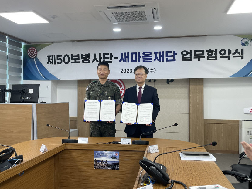새마을재단(대표이사 이승종)과 육군 제50보병사단은 14일 보병사단 백선엽실에서 장병들을 대상으로 추진하는 새마을 사업 교육과 연수 업무 협약을 체결했다.