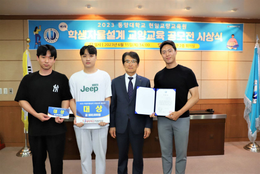| 동양대학교 현암교양교육원이 진행한 '2023년 학생자율설계 교양 교육 공모전'에서 대상을 받은 심경진·윤석빈·이인규(생활체육학과) 학생들이 이하운 총장과 기념촬영을 하고 있다. <동양대 제공> |