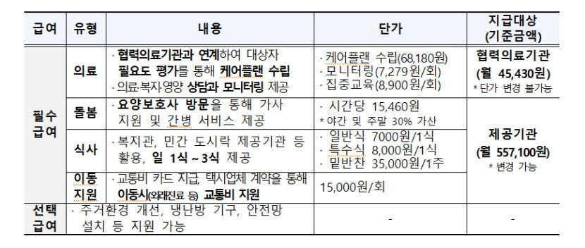 재가 의료급여 대상이 되는 수급권자는 의료급여관리사와 협력의료기관 케어팀(담당의사·간호사·사회복지사·영양사 등으로 구성)과의 의료·복지 필요도에 기반한 케이플랜을 바탕으로 최대 2년간 의료·돌봄·식사·이동지원 등의 서비스를 받게 된다.