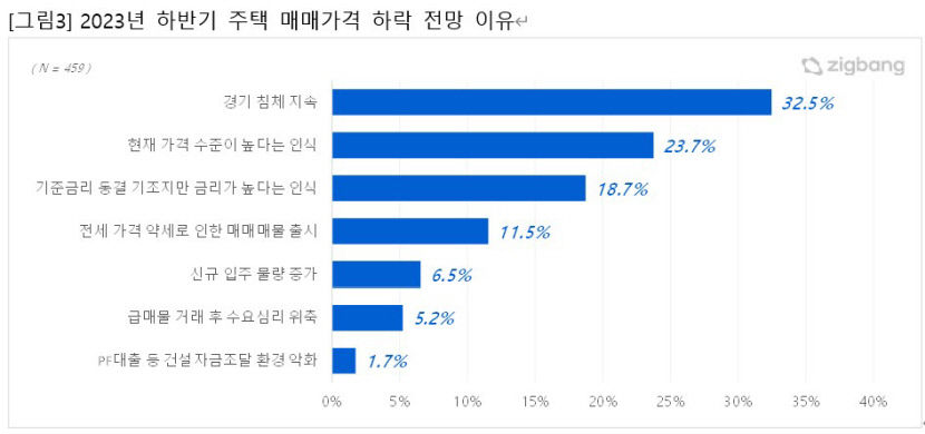 주택 매매가격 상승을 전망한 이유는 '저점 바닥 인식론 확산 기대'가 20.7%로 가장 많았다. △정부 규제 완화(20.1%) △금리인상 기조 둔화(15.4%) △매물 거래로 인한 실수요 유입(11.9%) △경기 회복 기대(11.3%) △전세가격 회복 조짐으로 매매 상승 기대(7.5%) 등이 그 뒤를 이었다.