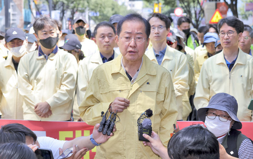 | 홍준표 대구시장이 17일 오전 '제15회 대구퀴어문화축제'가 열리는 대구 중구 대중교통전용지구를 찾아 "퀴어축제 주최 측의 불법 도로 점거를 도운 대구경찰청장에게 책임을 묻겠다"는 뜻을 밝히고 있다.이현덕기자 lhd@yeongnam.com |