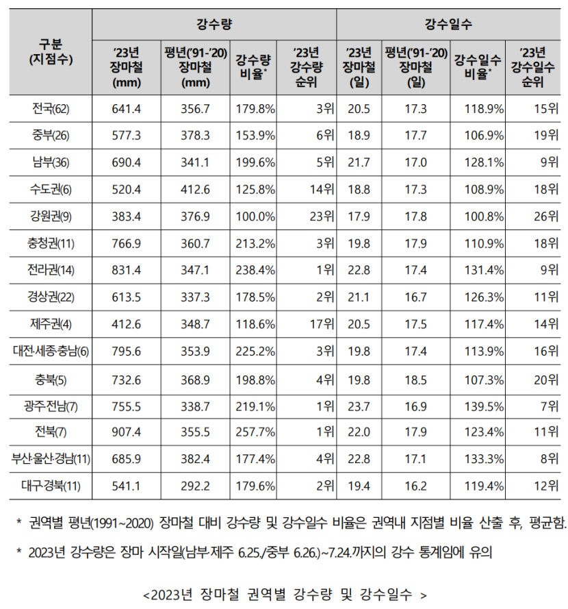 올해 장마 기간 강수량은 648.7㎜로 전국 관측망이 확충된 1973년 이래 세째로 많았다. 역대 장마 기간 강수량이 가장 많았던 해는 2006년(704.0㎜)이고, 그 다음이 2020년(701.4㎜)이다. 다만 장마 기간 강수 일수 대비 강수량인 강우 강도는 올해가 가장 강했다. 올해 장마 기간 중 비가 내린 강수 일수는 21.2일로 강우 강도는 30.6㎜다. 2006년엔 강수 일수가 27.0일로 강우 강도는 26.1㎜이었으며, 2020년은 28.7일 비가 내리면서 강우 강도는 24.4㎜로 나타났다.